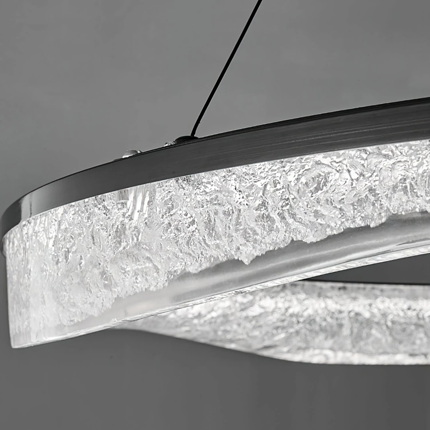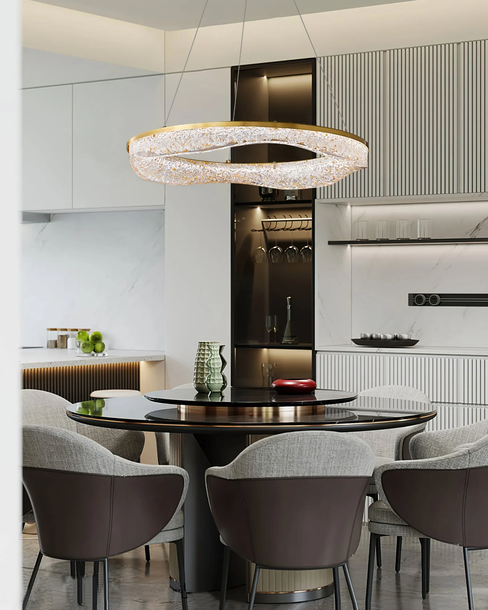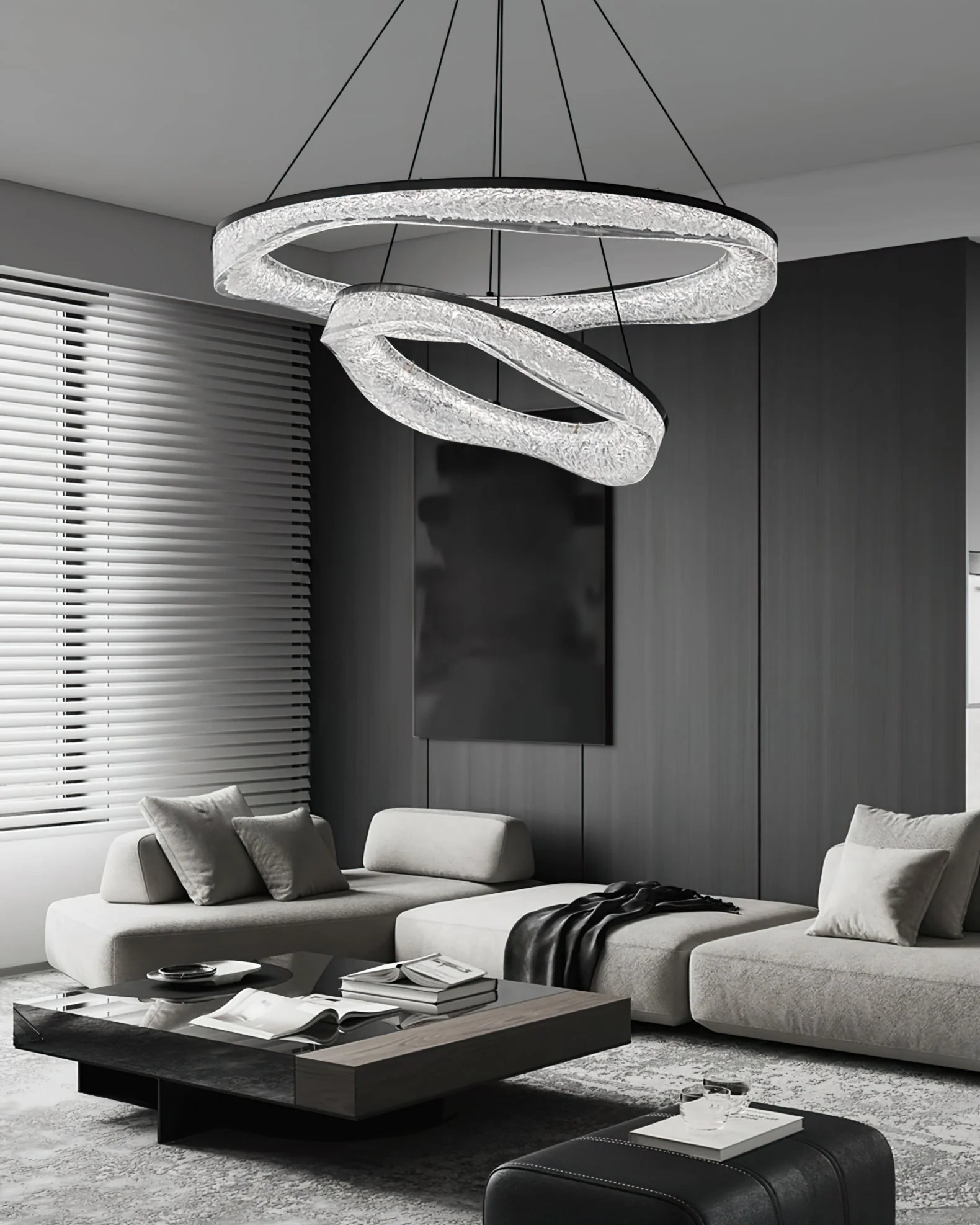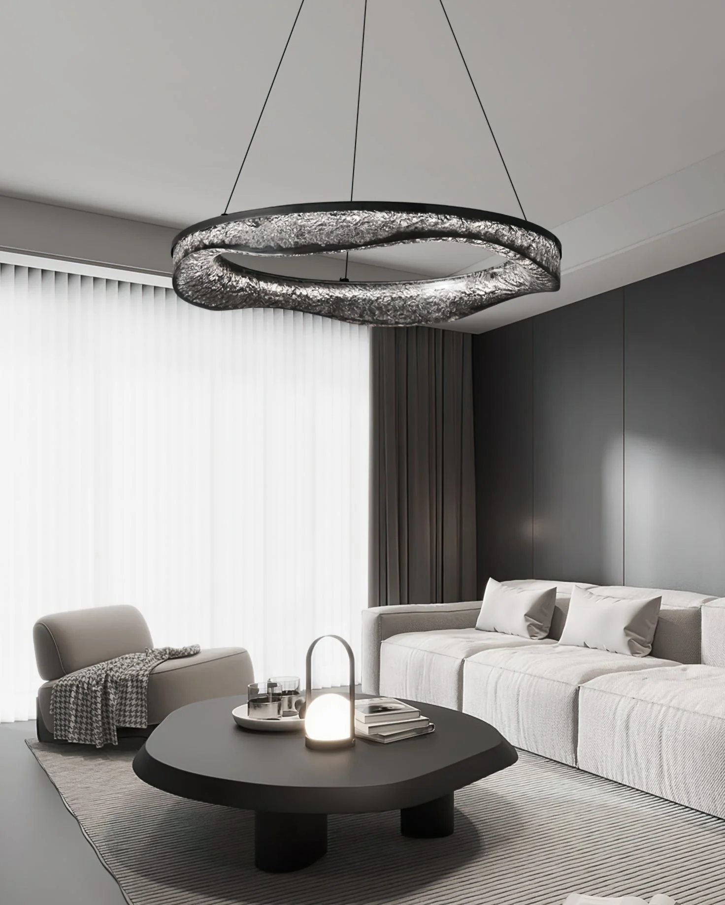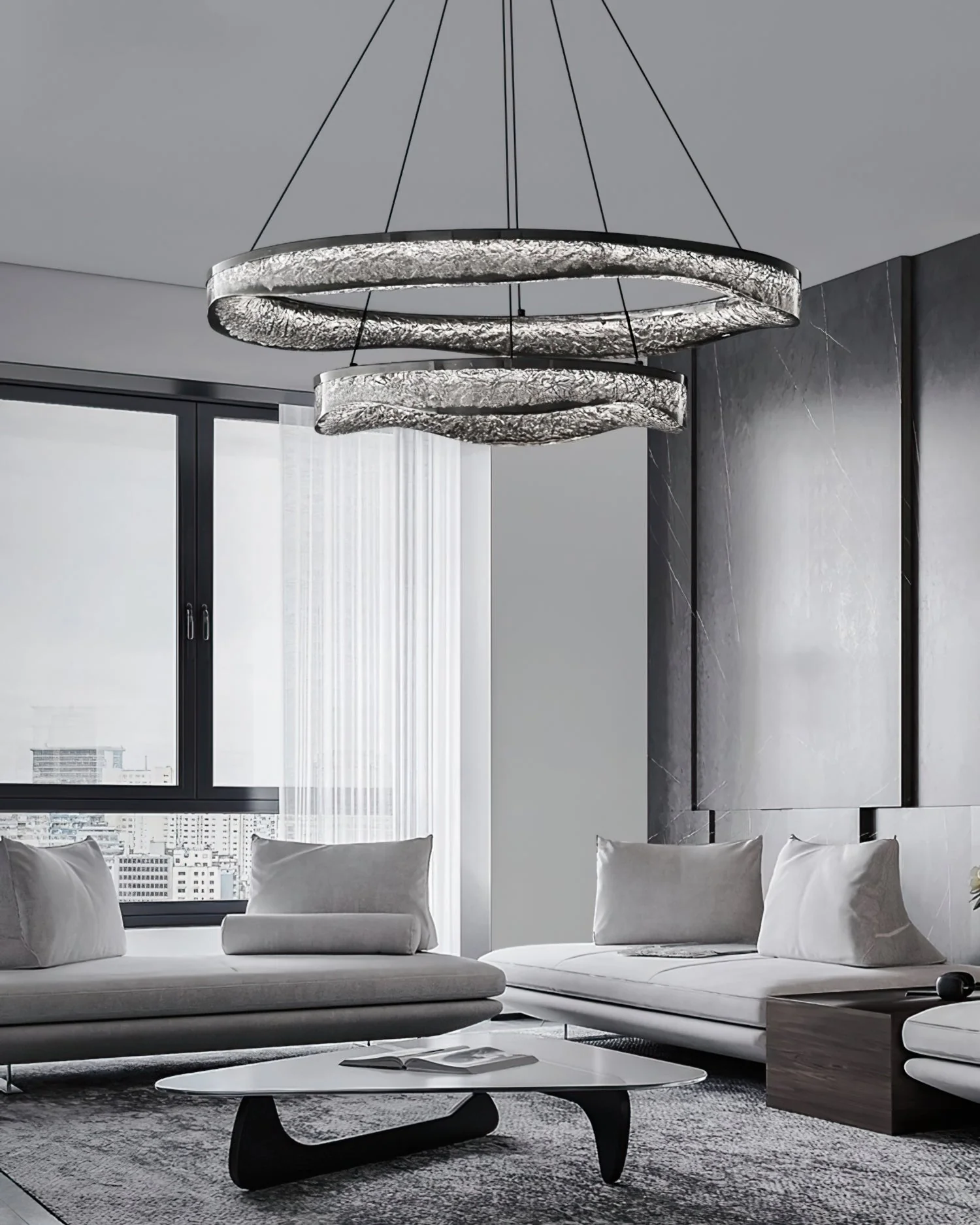 The Aurelia Ring Chandelier features a refined composition of flowing illuminated rings, blending sculptural form with soft ambient lighting. Crafted from brass and textured resin, each ring gently diffuses light to create a warm, atmospheric glow that enhances modern interiors.