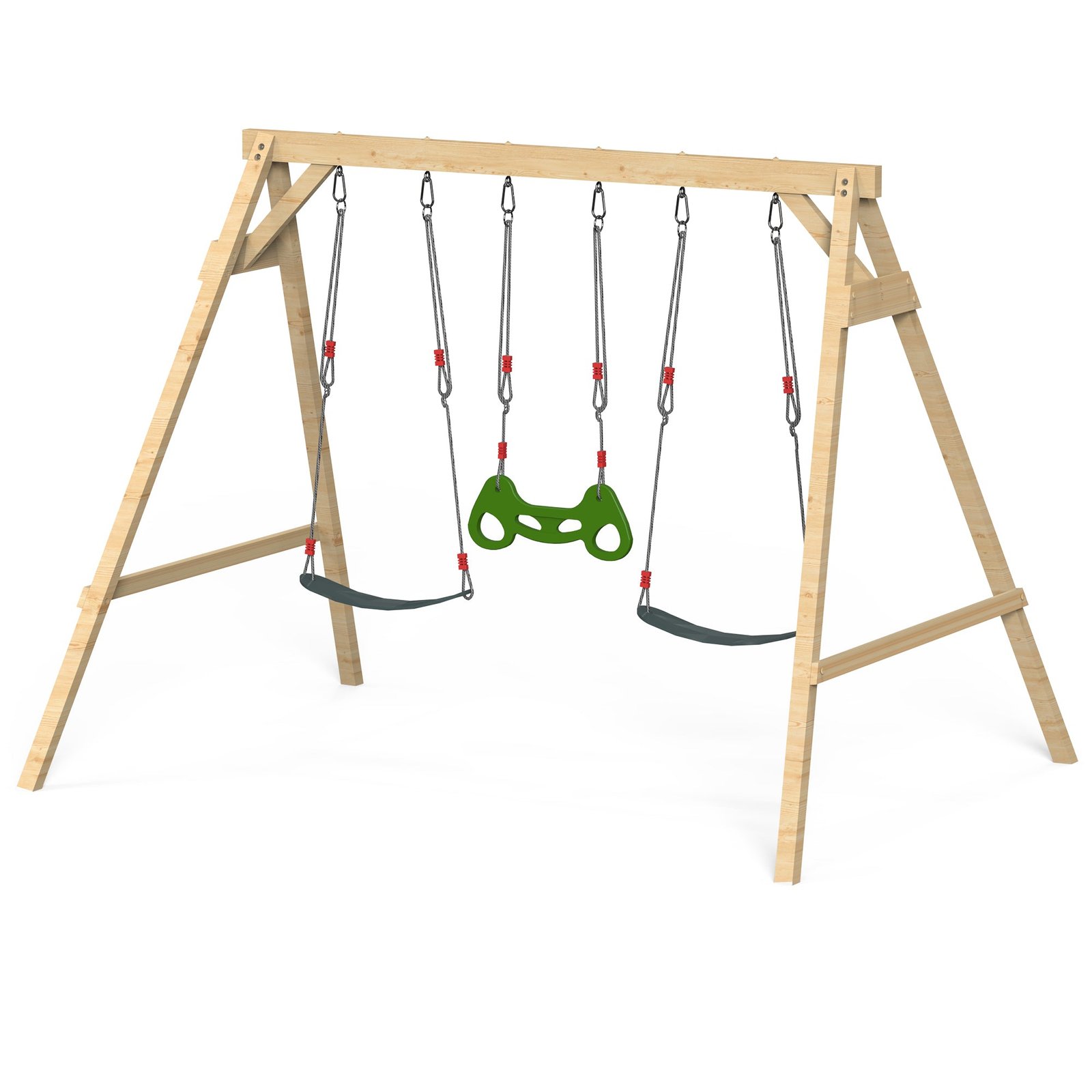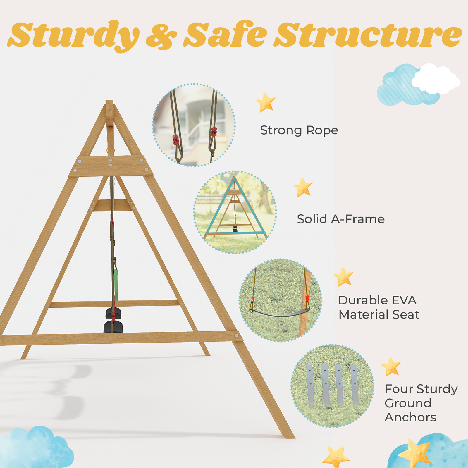 This wooden swing set for the backyard is made of high-quality European spruce wood and is weather-resistant and paint-treated for durability. The set includes a ground anchor and a fixing pegboard for maximum stability, ensuring it is firmly held in place and ensuring the safety of children while playing.