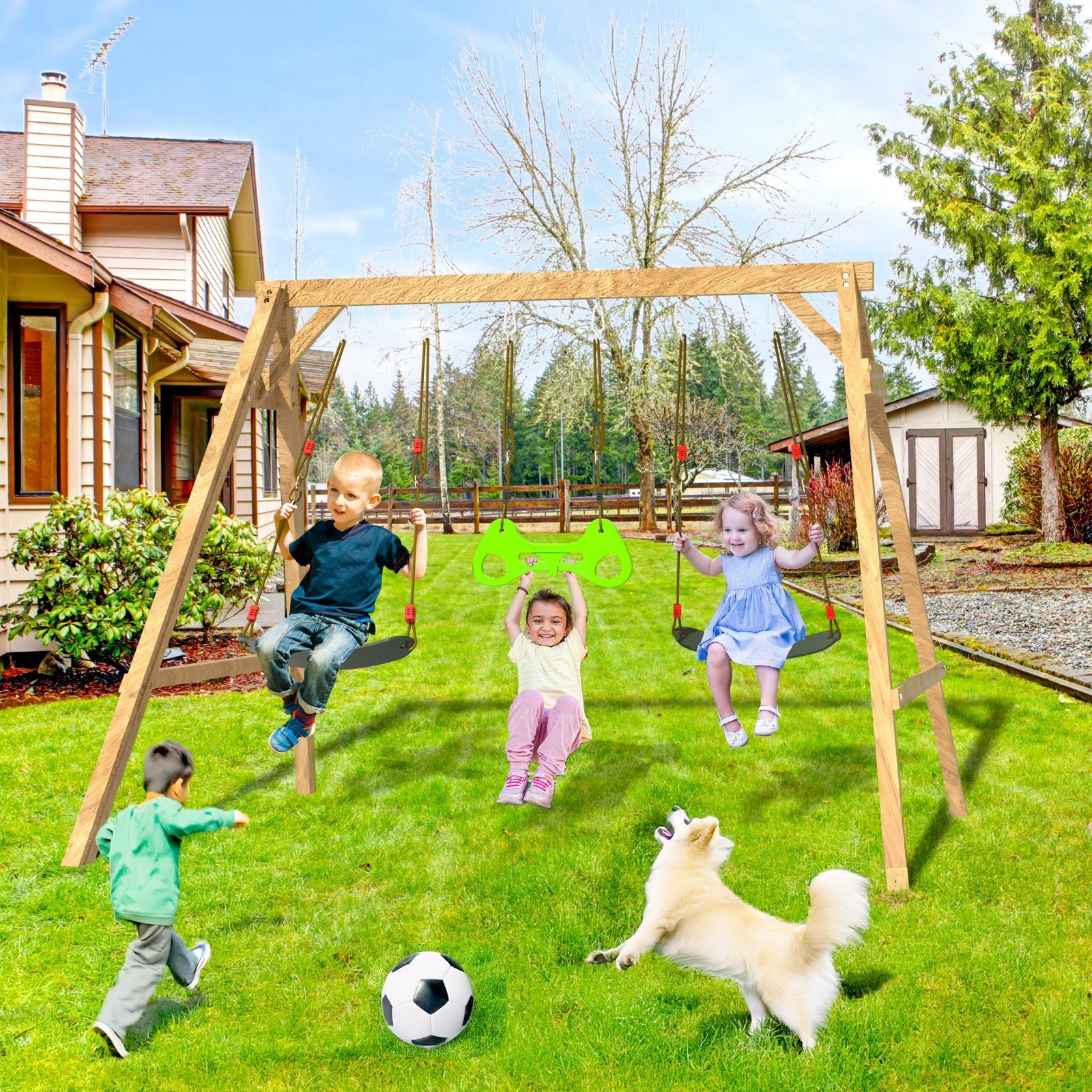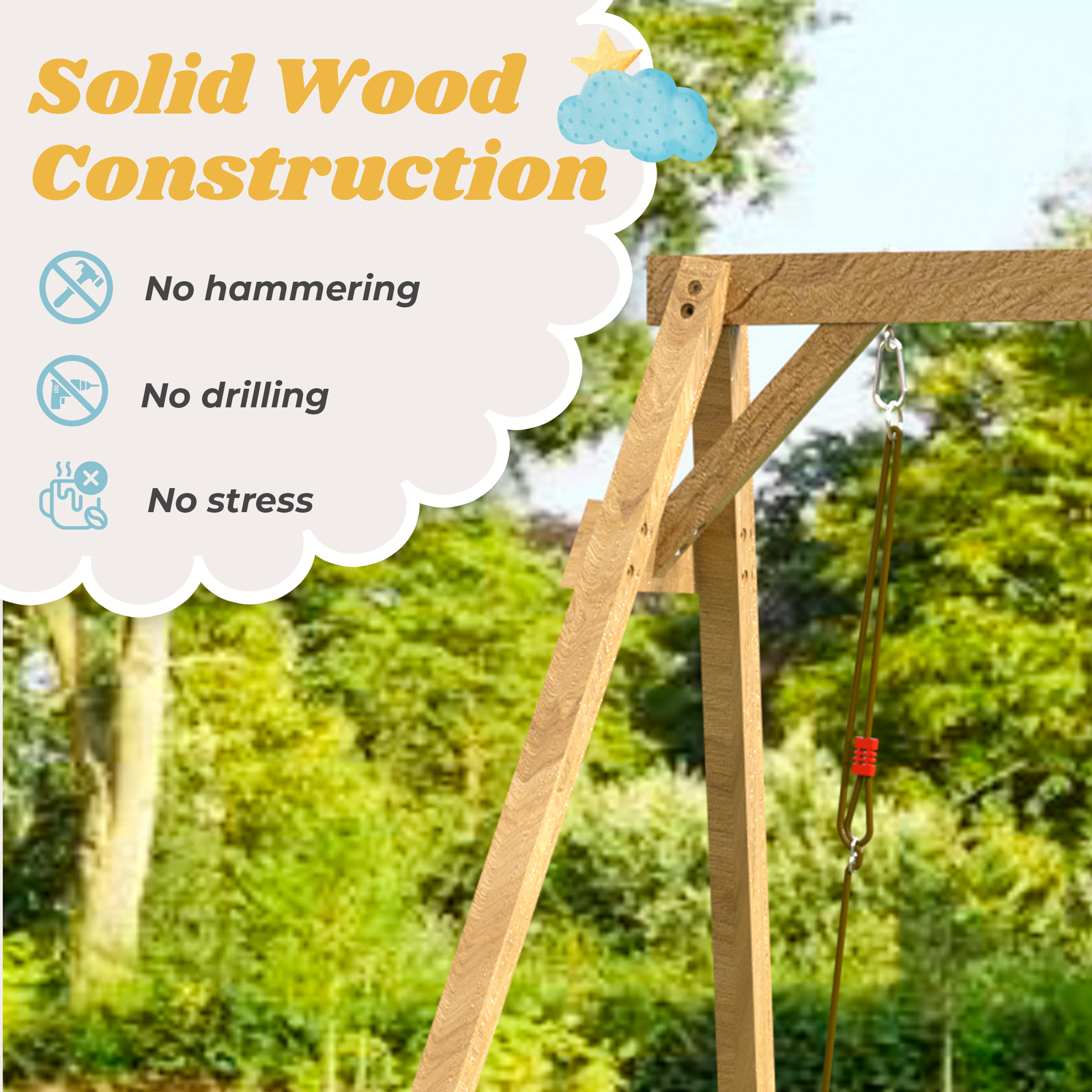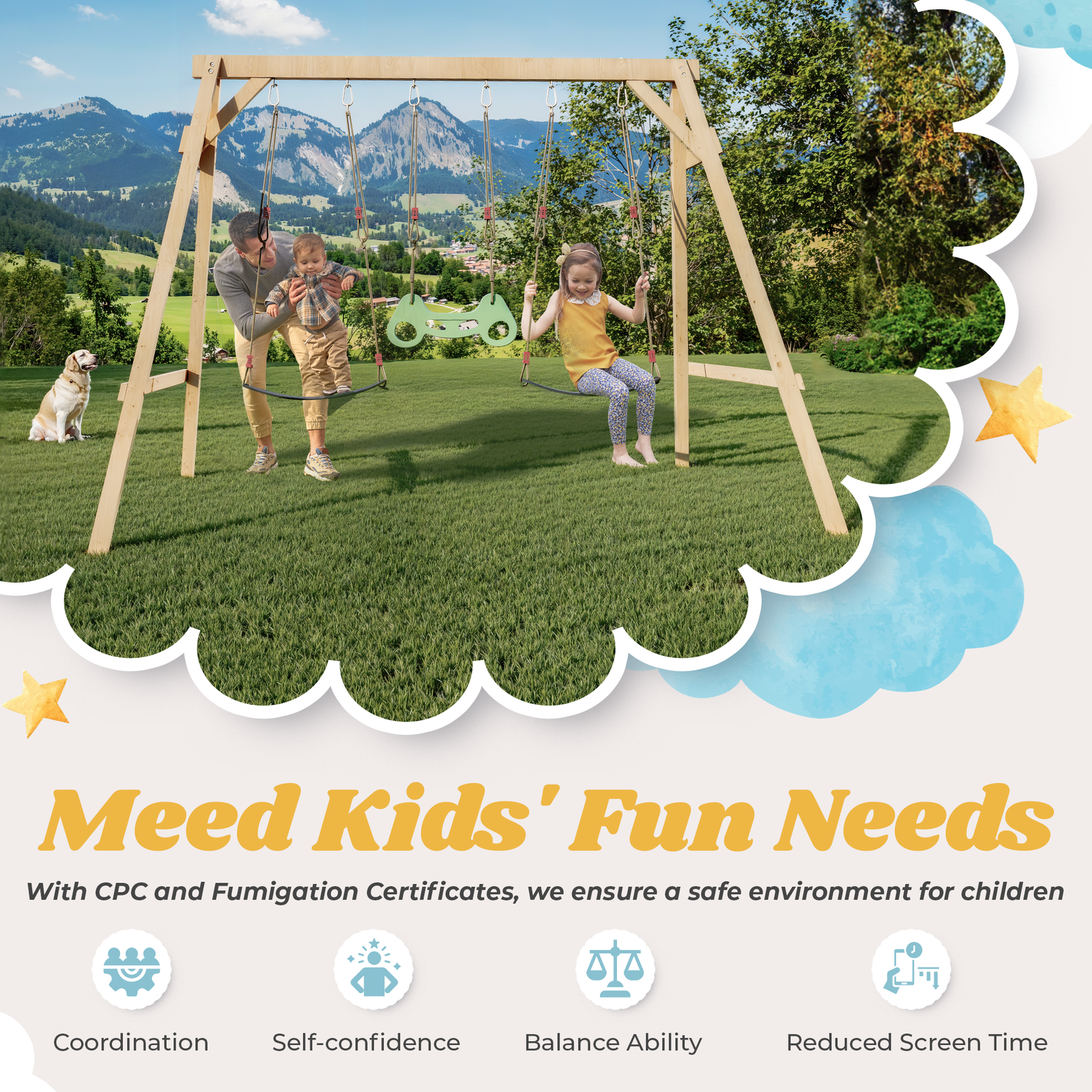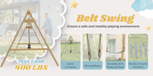 This wooden swing set outdoor for kids is coated with imported weather-resistant water-based paint, which significantly extends the service life of the wood and ensures that it can withstand all outdoor conditions, regardless of wind or rain, supporting children’s all-weather play.