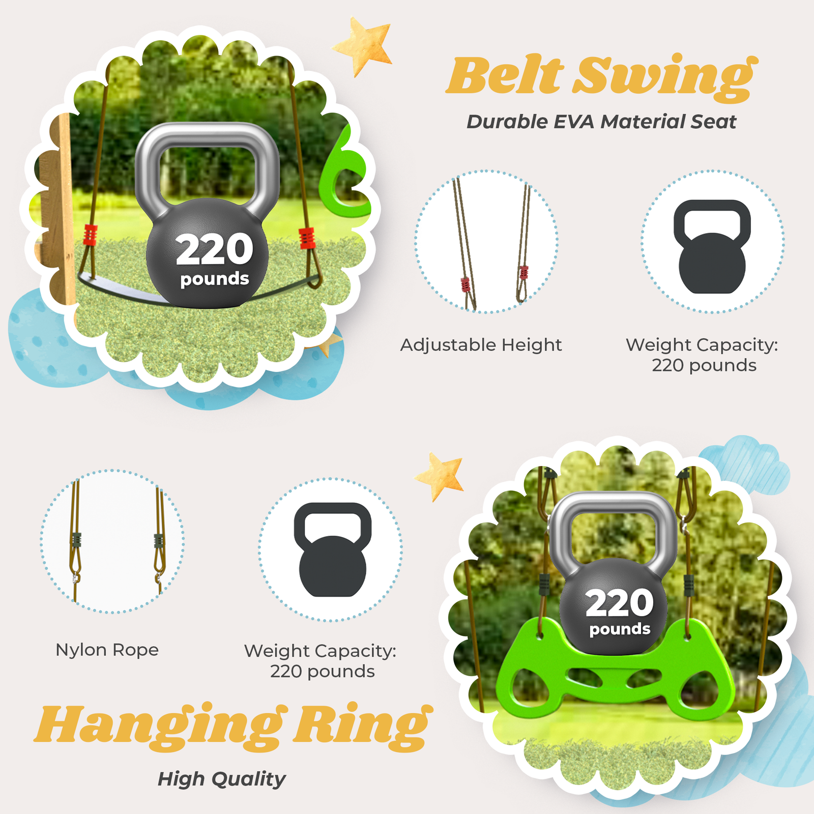 This backyard playground set with 2 EVA nylon rope swings and a hanging ring offers a variety of play options to let your children experience the outdoors and watch them grow in play, exploration and imagination.