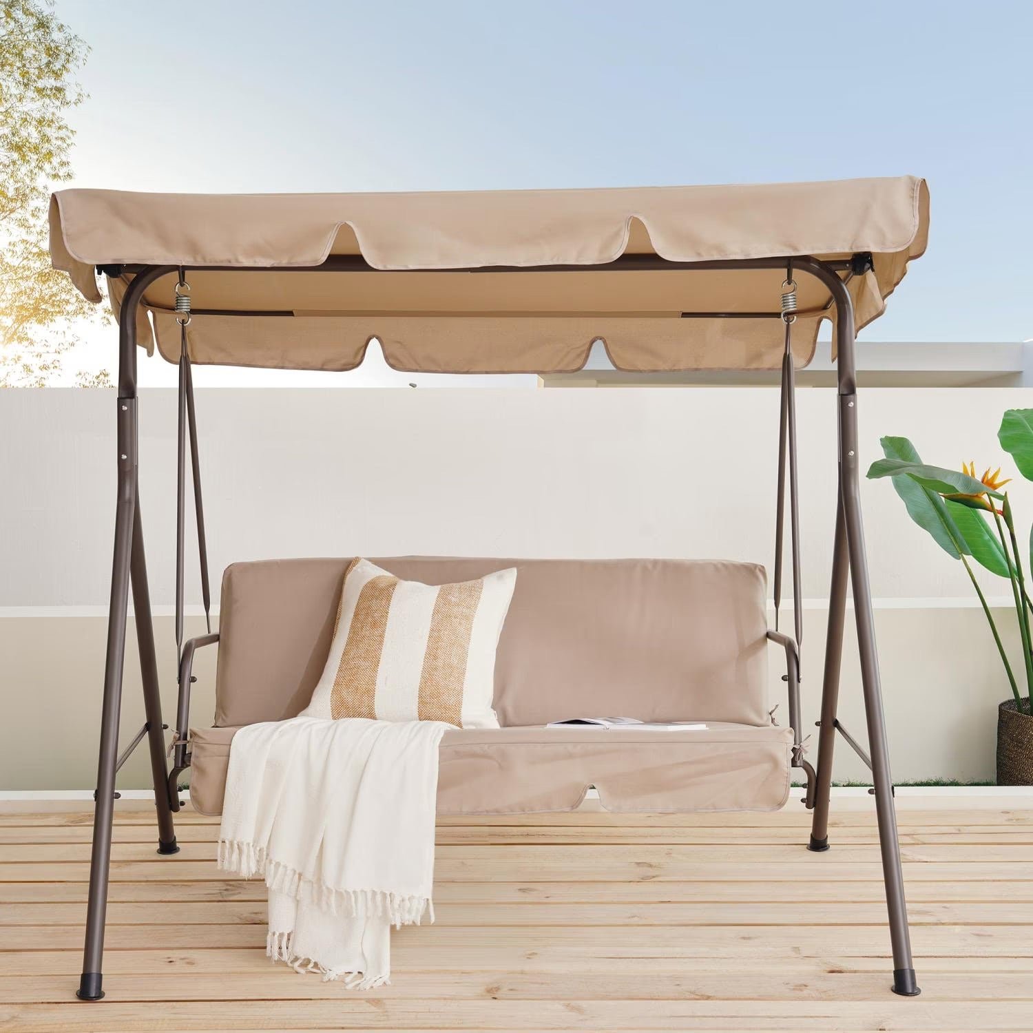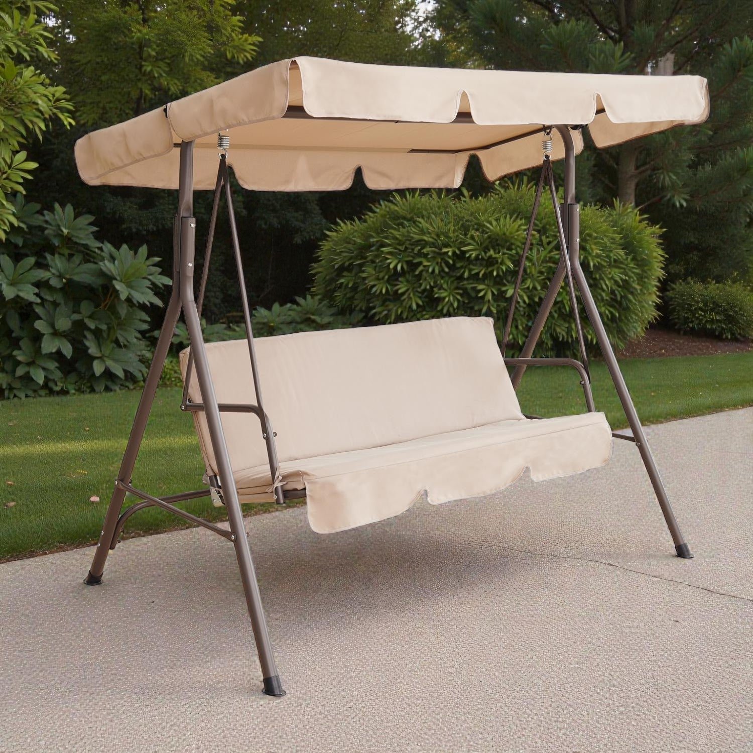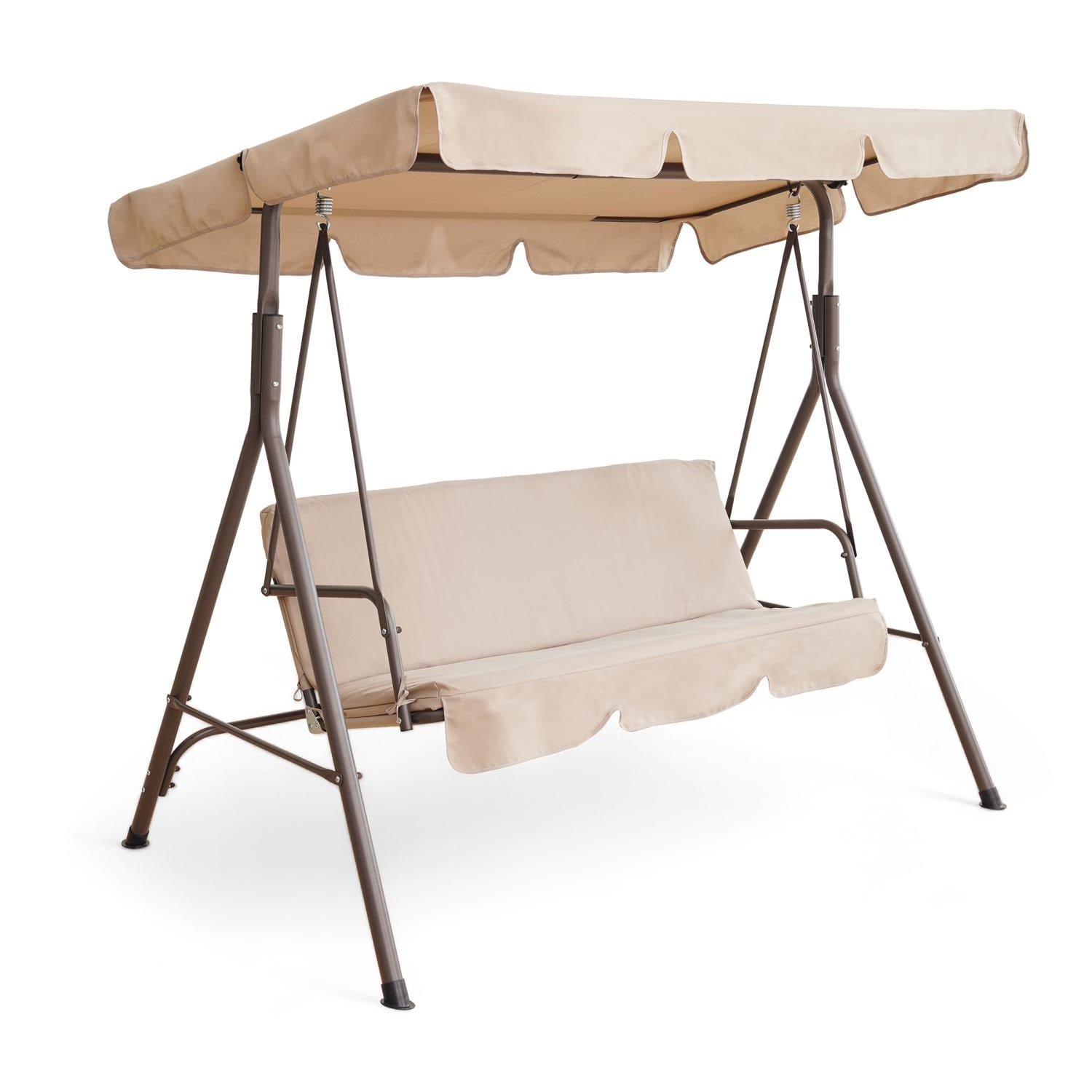 - Features: 3-seater swing, removable canopy, weather-resistant, durable steel frame, stable construction, comfortable fiber-filled cushions, easy to clean