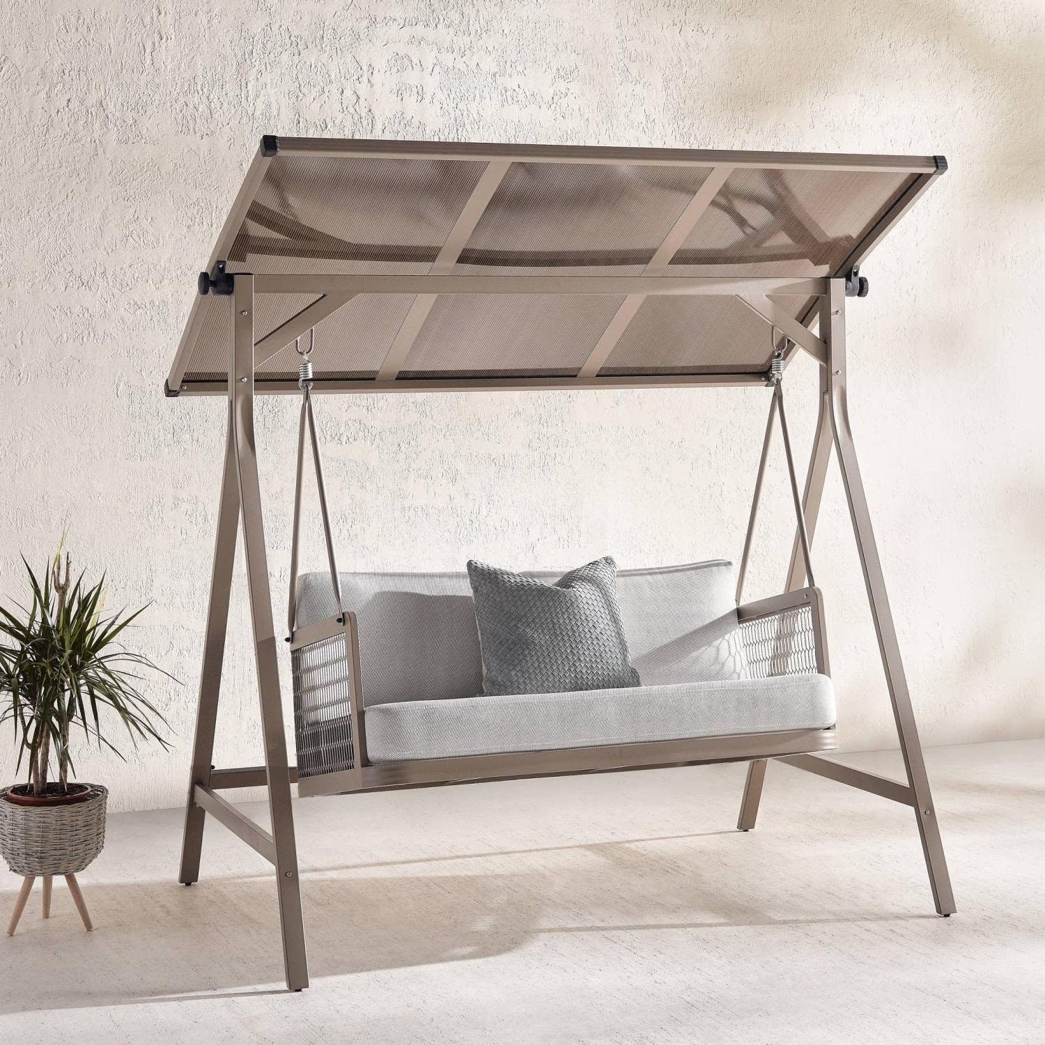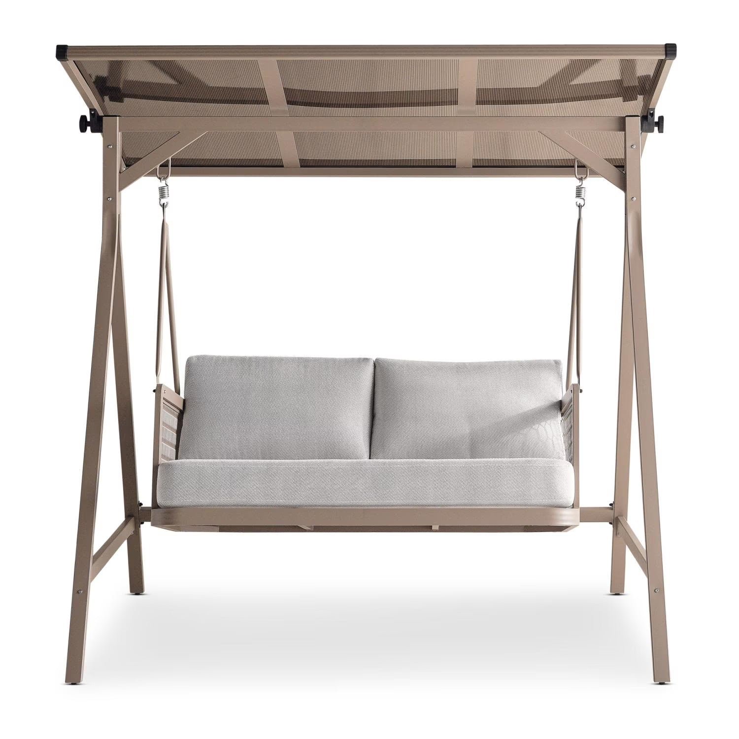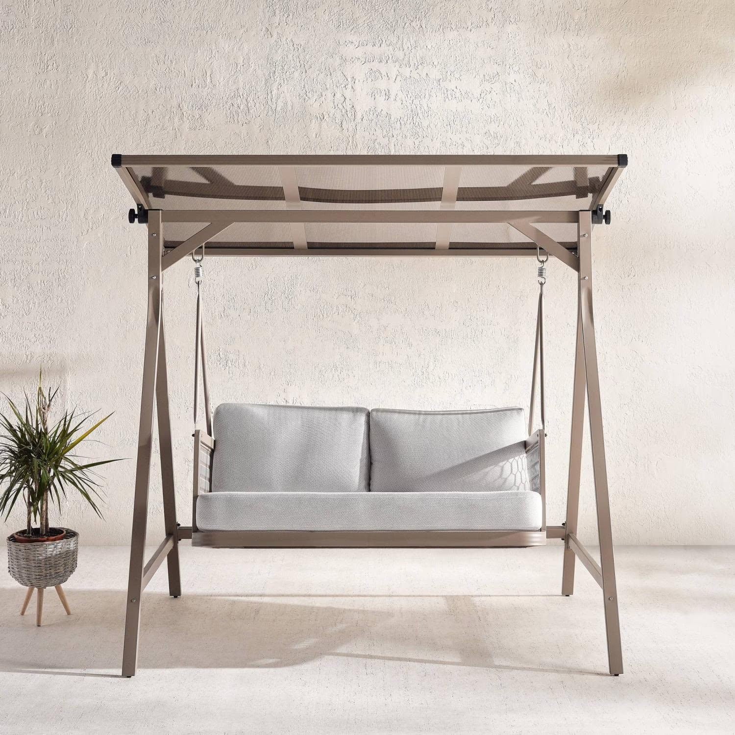 Enjoy outdoor relaxation with this 2-seater swing with a light brown frame. Designed for both comfort and durability, it features a sturdy powder-coated aluminum frame and a textured fabric seat that resists everyday wear.