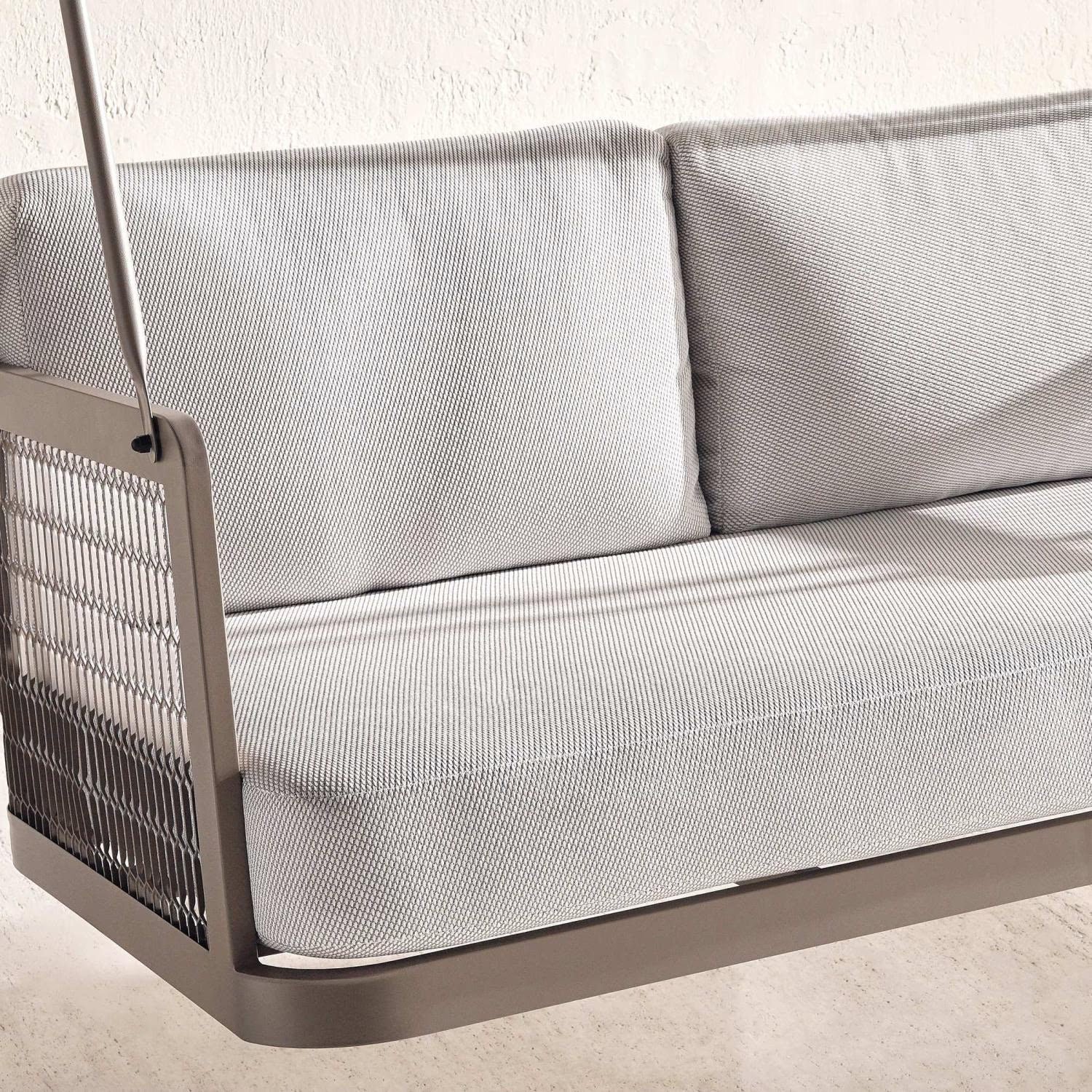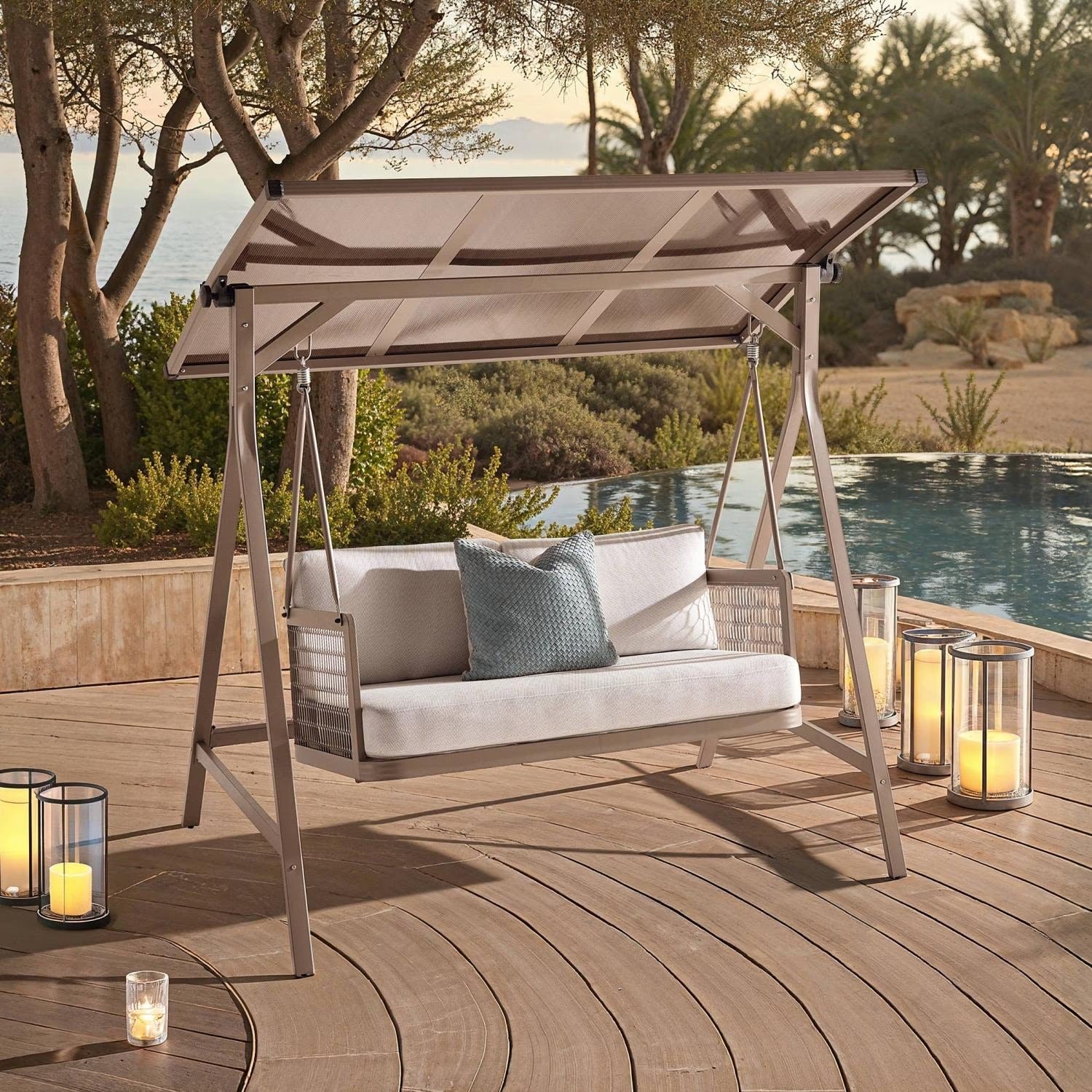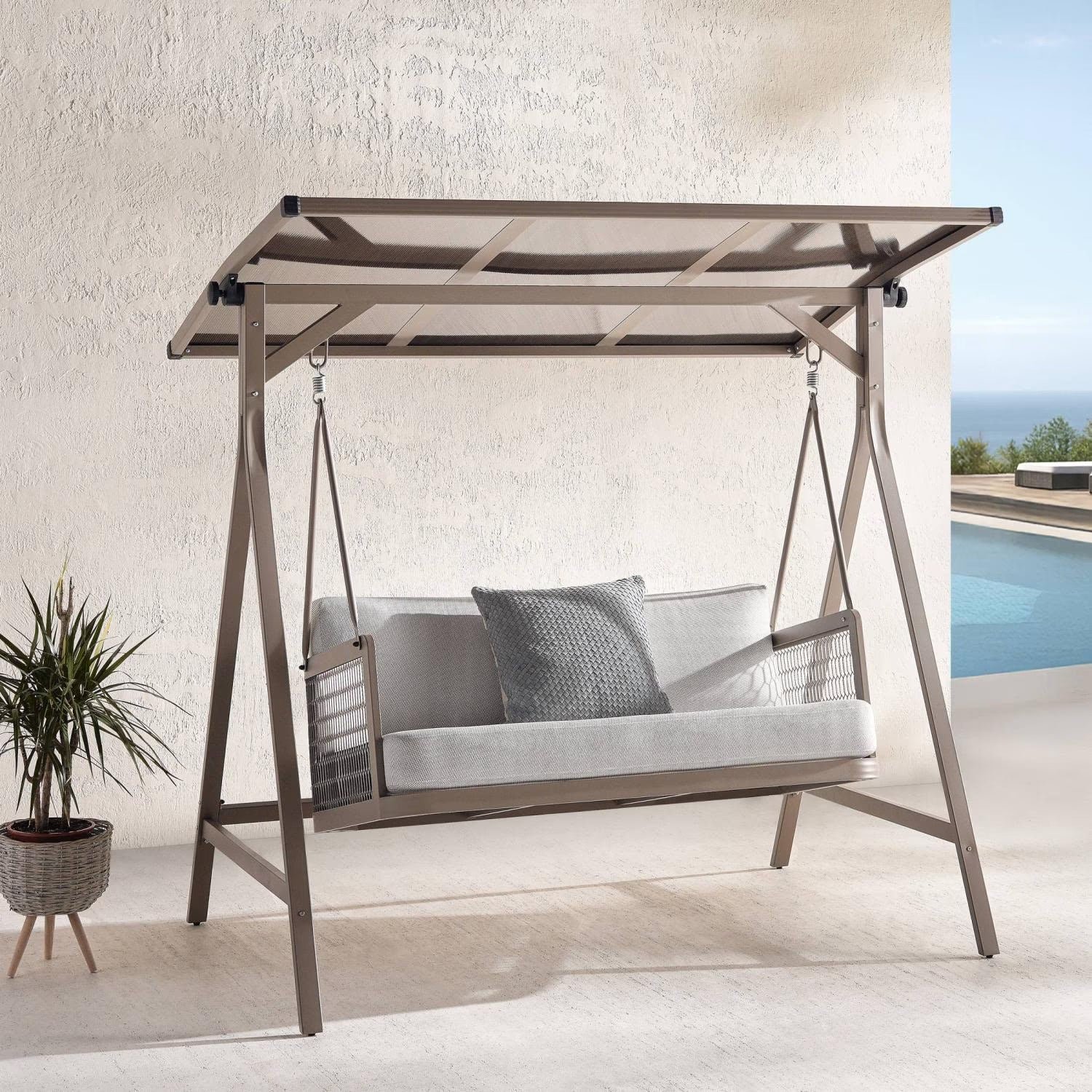 Enjoy outdoor relaxation with this 2-seater swing with a light brown frame. Designed for both comfort and durability, it features a sturdy powder-coated aluminum frame and a textured fabric seat that resists everyday wear.