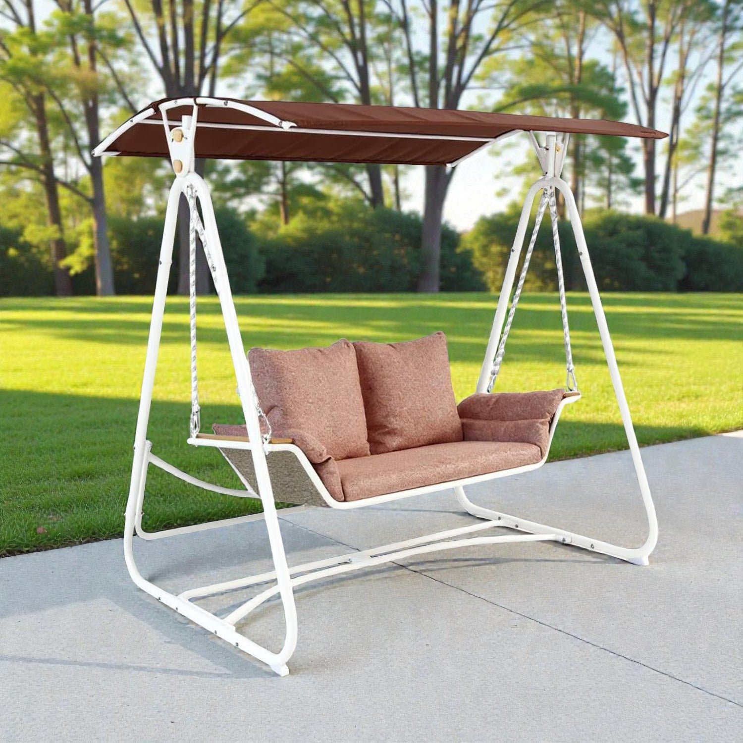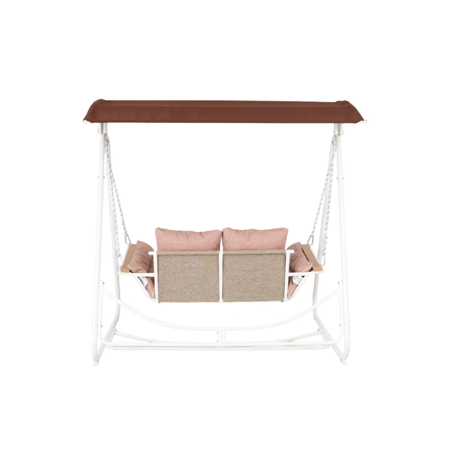 Create a comfortable outdoor retreat with this 2-seater swing in a warm brown finish. Built with a sturdy, powder-coated aluminum frame, it provides reliable durability and resistance to outdoor conditions. The weather-resistant fabric seat ensures comfort and easy upkeep, making it suitable for patios, gardens, or balconies.
