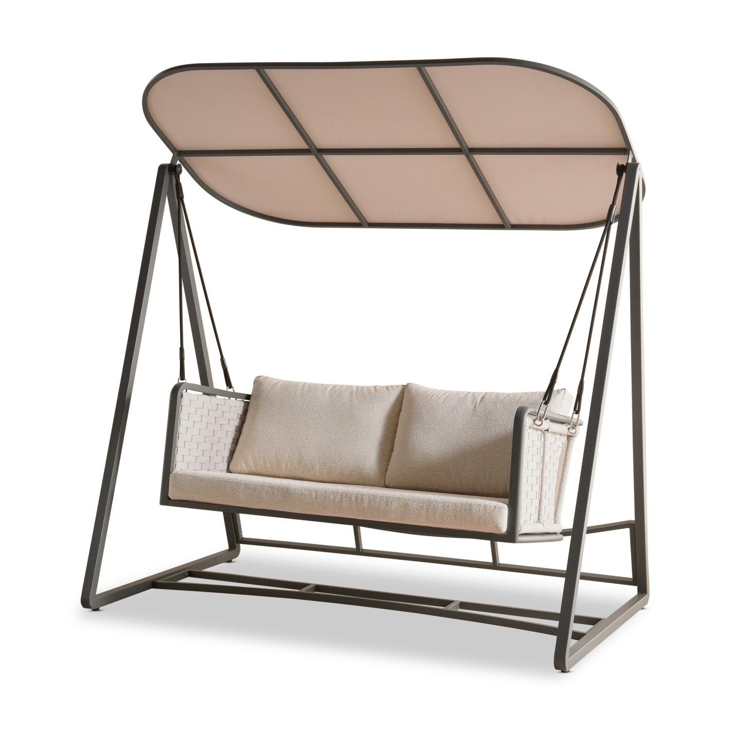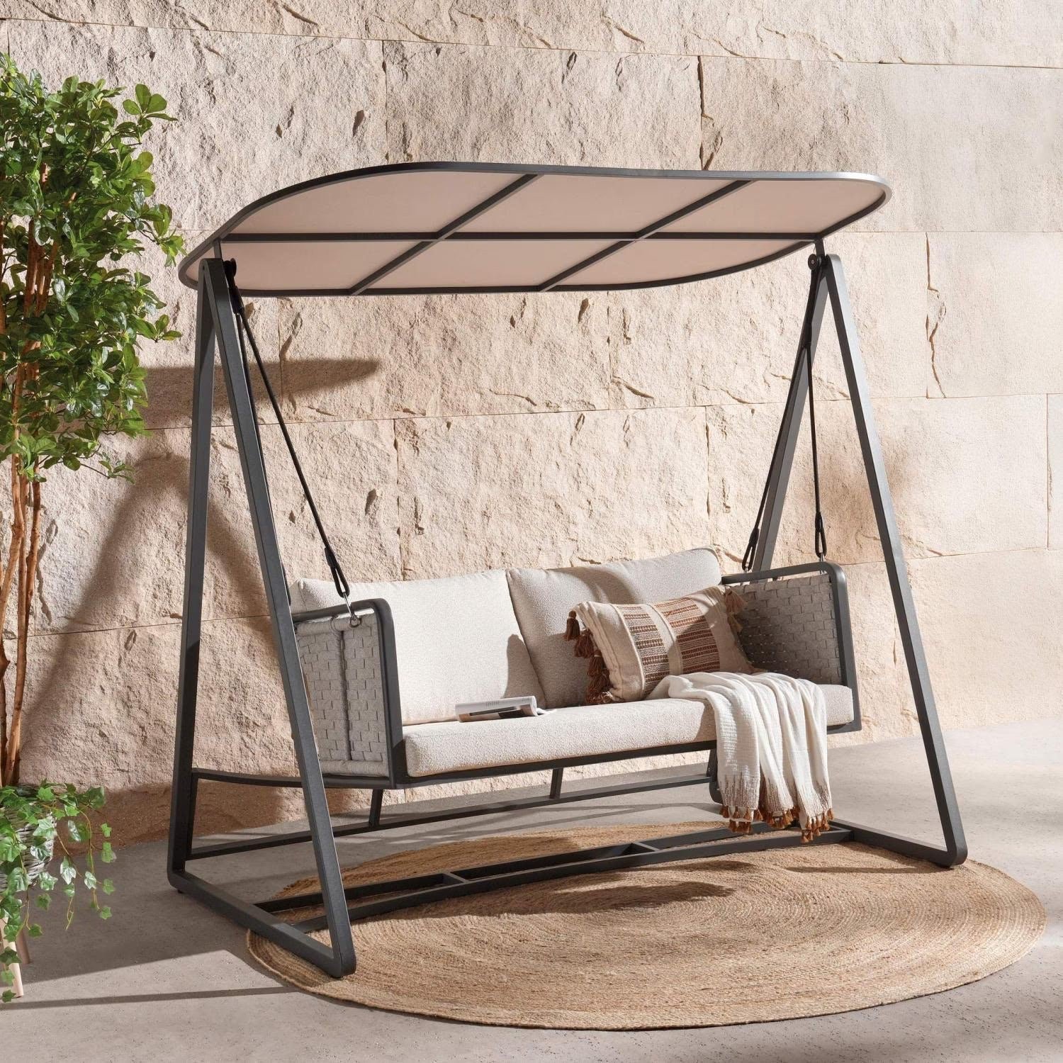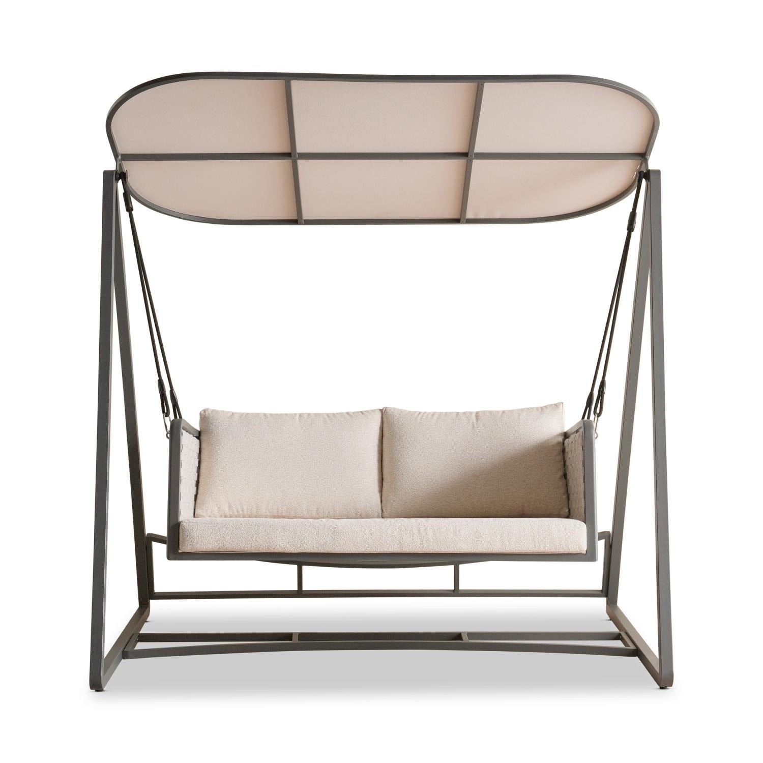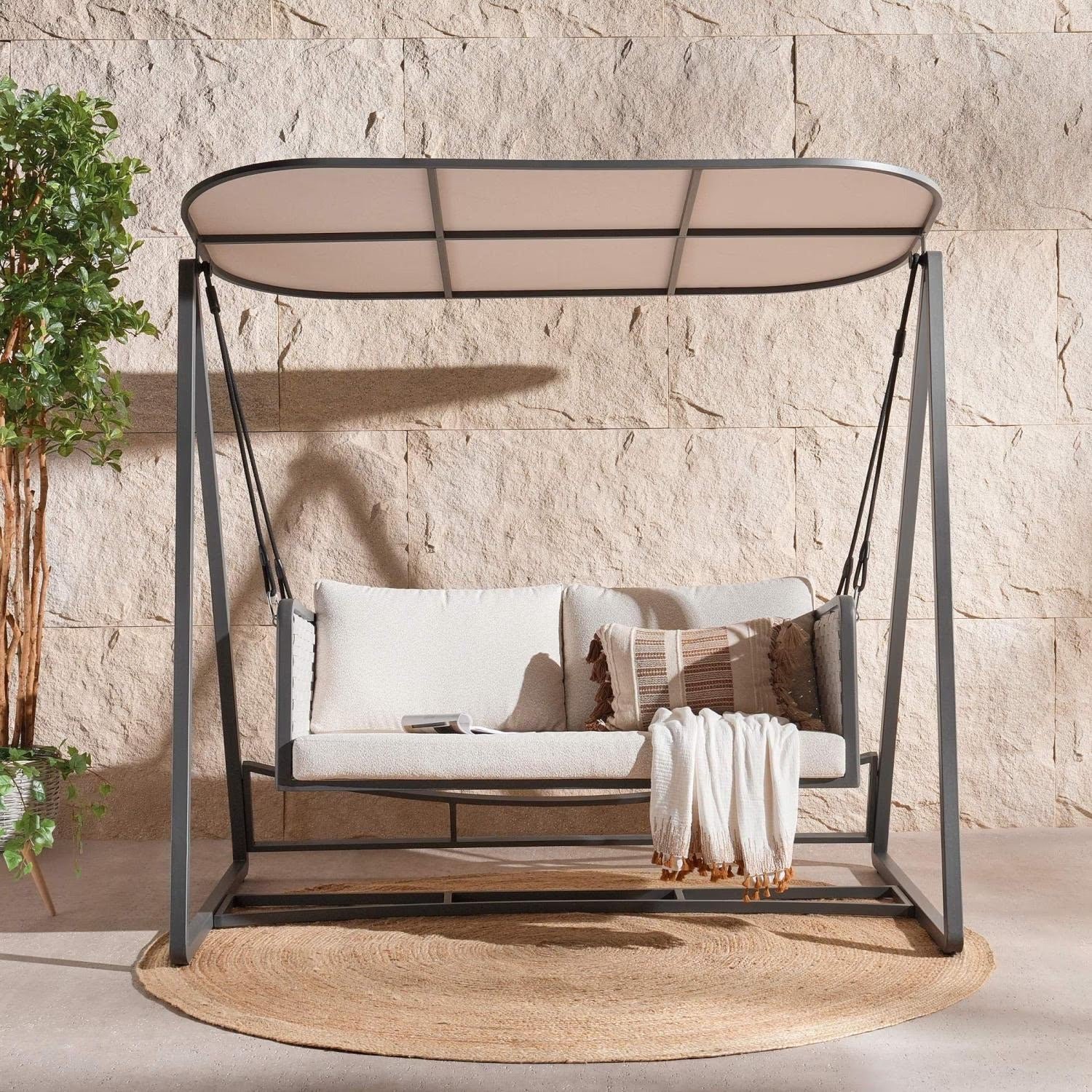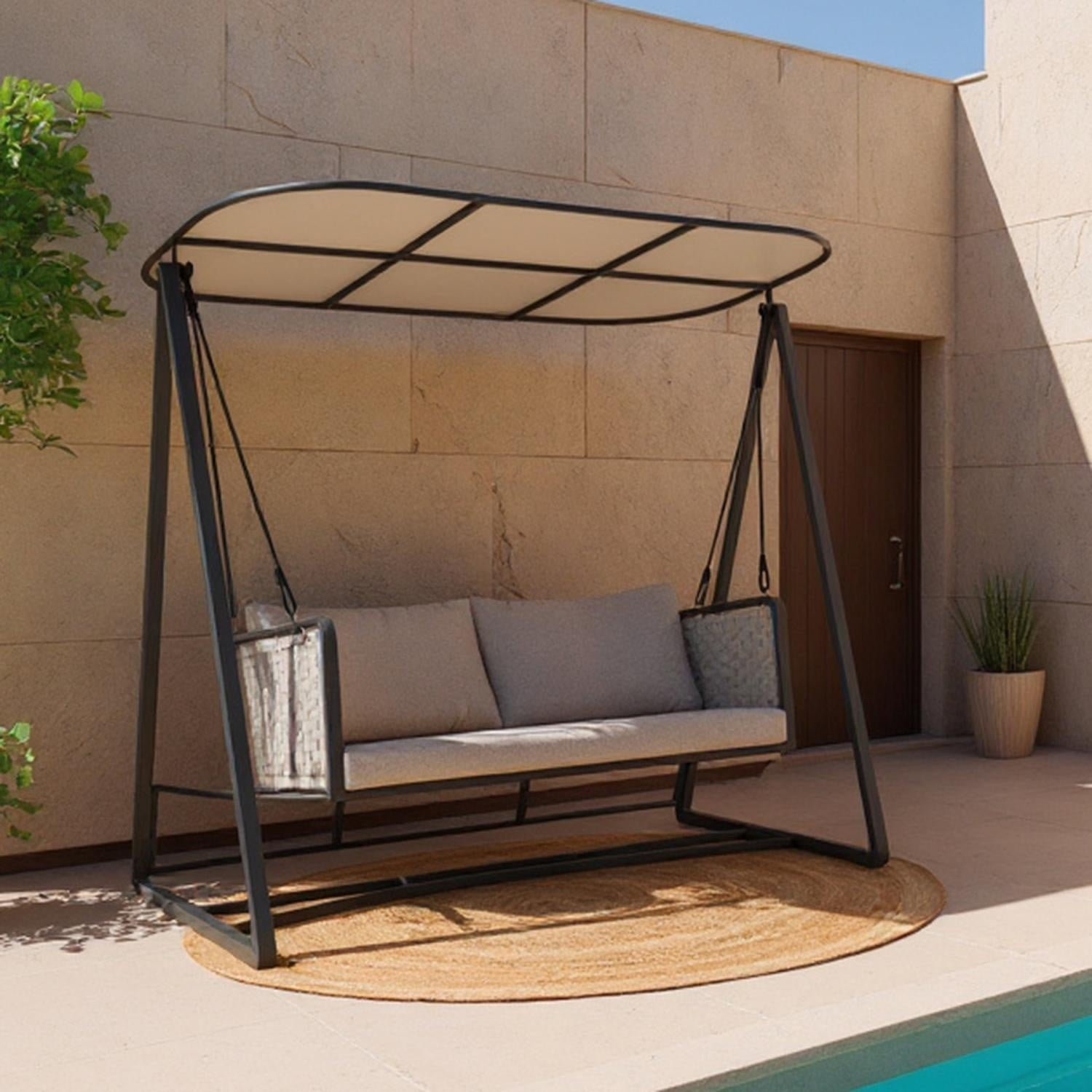 This swing features a sturdy metal frame with soft, removable cushions made from weather-resistant fabric. The in-built padded seat provides gentle support, while the adjustable swing design allows for comfortable lounging.