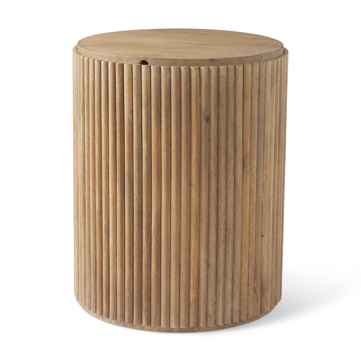 The light brown Terra Side Table is a beautiful statement piece to include in the home or office space. Bold, contemporary, and trendy this eye-catching piece has been fashioned from solid mango wood, whose beautiful grain can be seen on the round top and amidst the fluted round base. Not only is this side table stunning, but it also opens from the top to provide storage!